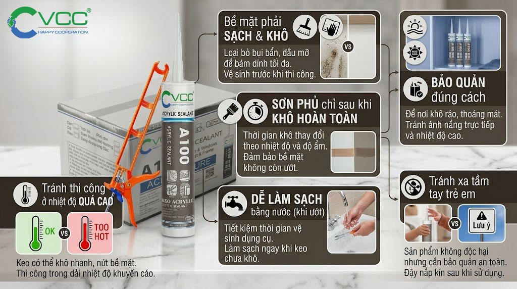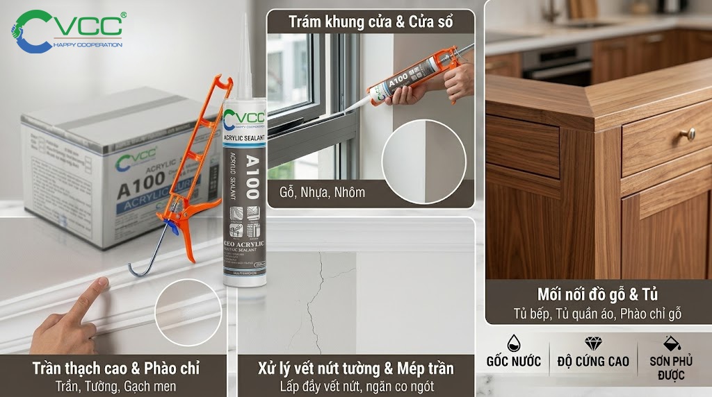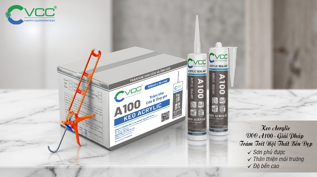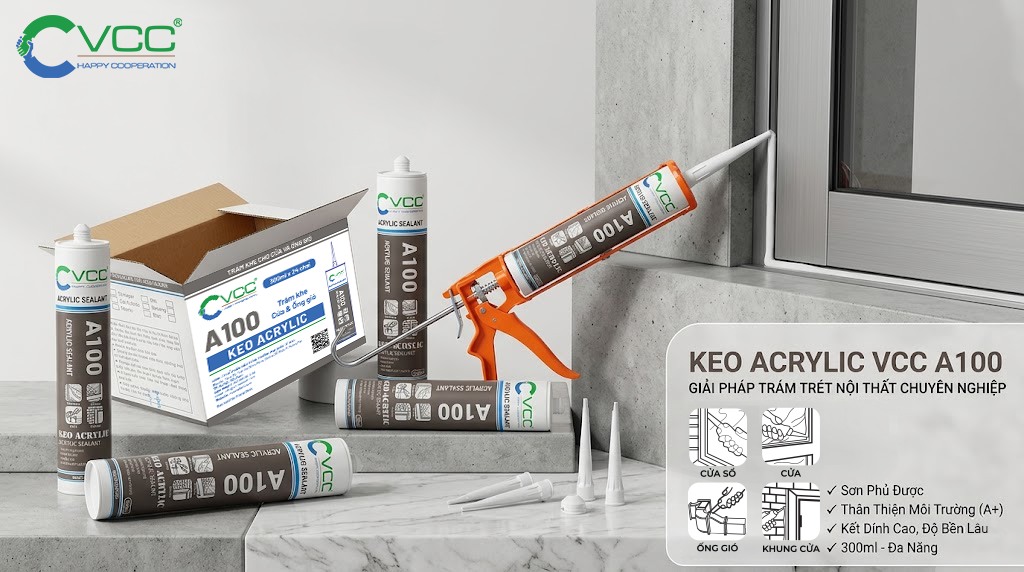 keo acrylic VCC A100 của VCC là keo chất lượng cao, bám dính tốt, dễ sử dụng, lý tưởng cho trám trét và trang trí cửa, cửa sổ, tủ gỗ, trần và gạch men.