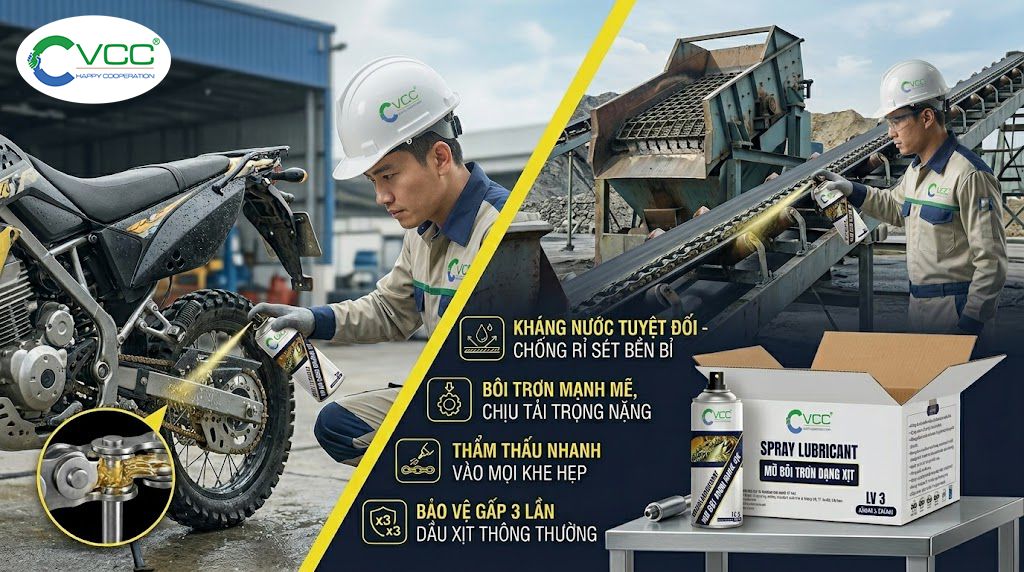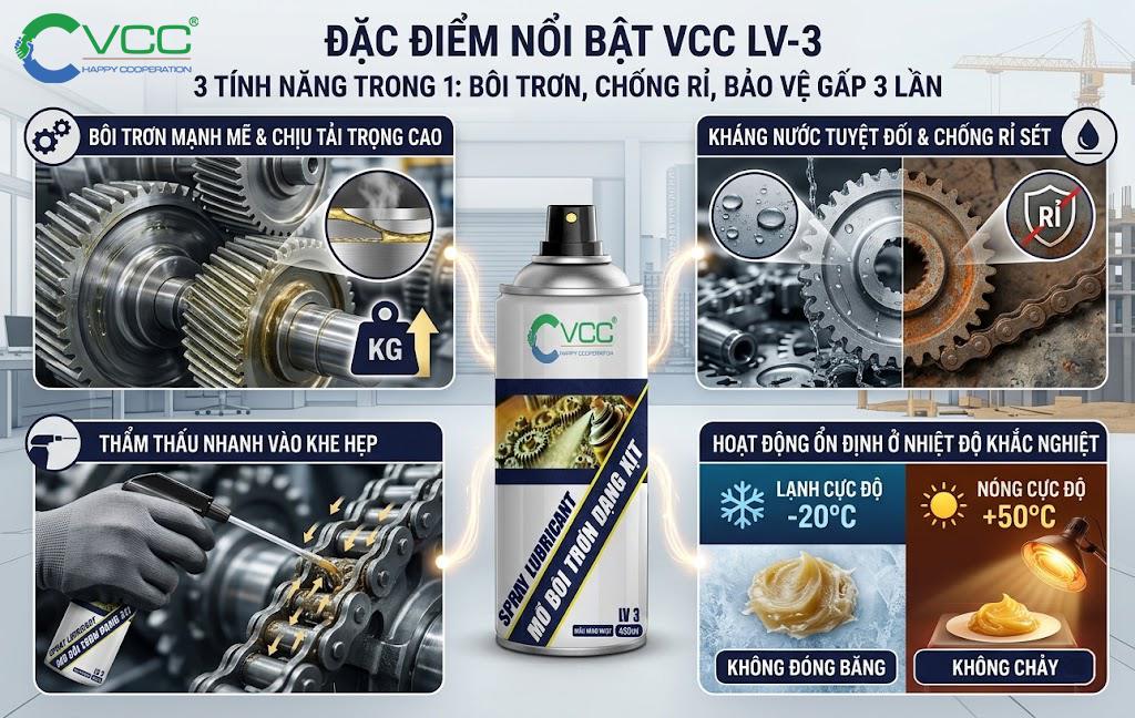 Mỡ bôi trơn dạng xịt VCC LV-3 (hay còn gọi là mỡ bò dạng xịt) là giải pháp bảo dưỡng thiết bị toàn diện. Với công thức gốc Lithium cao cấp; sản phẩm giúp bôi trơn, chống rỉ sét và bảo vệ chi tiết máy bền bỉ hơn gấp 3 lần so với dầu xịt thông thường
