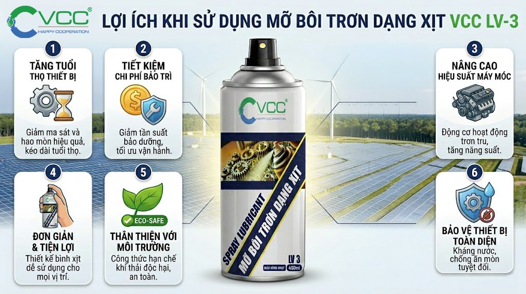Sản phẩm không chỉ tăng tuổi thọ cho máy móc, mà còn giúp tiết kiệm chi phí bảo trì và tăng năng suất sản xuất. Hãy lựa chọn mỡ bôi trơn dạng xịt LV 3 của VCC để đảm bảo thiết bị của bạn luôn vận hành trơn tru và bền bỉ.