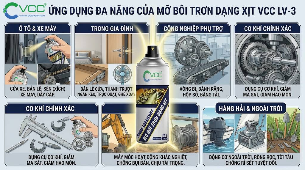 Mỡ bôi trơn dạng xịt LV 3 của VCC được sử dụng rộng rãi trong các ngành công nghiệp nhờ khả năng thích ứng đa dạng: