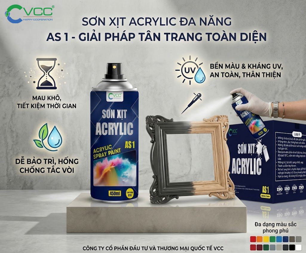 Sơn acrylic dạng xịt AS 1 của VCC là giải pháp tối ưu cho những ai đang tìm kiếm một loại sơn phun chất lượng cao. Sản phẩm mang lại lớp phủ bề mặt sáng bóng, bền đẹp và nhanh khô.