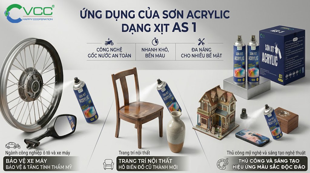 Với đặc tính nhanh khô, bền màu và an toàn cho người dùng, sơn xịt acrylic AS 1 của VCC là giải pháp lý tưởng cho các ngành công nghiệp ô tô, nội thất và trang trí. Sản phẩm không chỉ giúp bảo vệ bề mặt khỏi các tác nhân môi trường mà còn tạo nên hiệu ứng thẩm mỹ cao, giúp các sản phẩm thêm phần nổi bật và chuyên nghiệp.